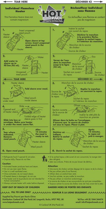 - Heats soft-pack meals without fire or stove