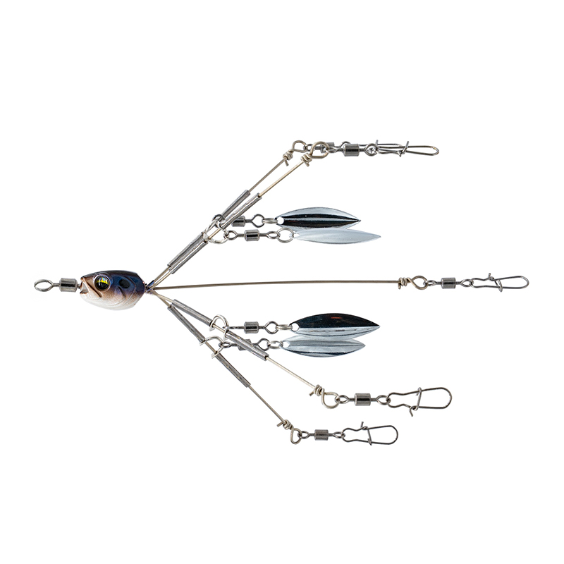 Five stainless spring wire arms provide a balanced spread with natural flash and a controlled vibration, allowing you to run smaller shads and swimbaits on light jig heads without overpowering the fish. The sculpted 3D head with realistic detail, combined with an integrated swivel, keeps the rig tracking straight and reduces torque during the fight for better control and hook-up efficiency.