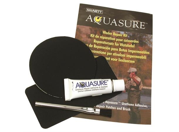 The repair kit includes a 7-gram mini tube of AquaSure, a brush for applying a thin layer of adhesive, and two patches that can be taped over the leak or used on the opposite side (waders).