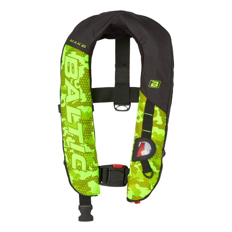 The Baltic Mako life jacket is designed in collaboration with experienced anglers to provide the perfect life jacket for fishing. It is an inflatable jacket with 165N buoyancy, certified according to EN ISO 12402-3. It features a zippered pocket, an easy-access mesh pocket, and an inspection window with green indicators to