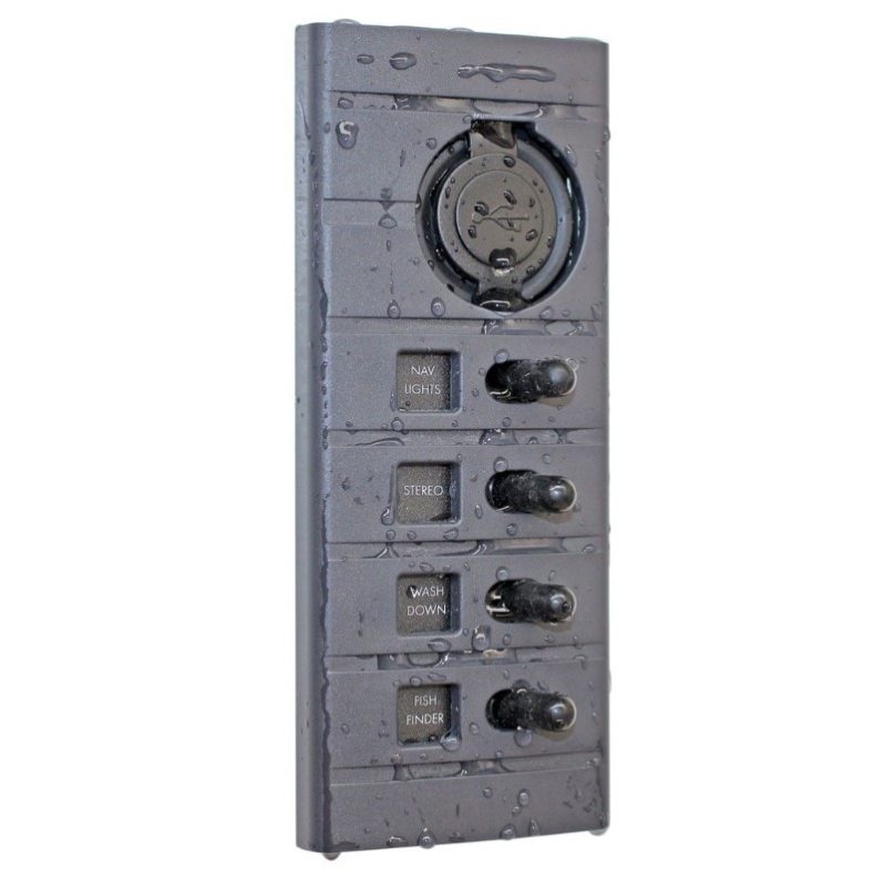 IP65 rated switch panel from Connex with dual USB sockets, LED indication and fuses.
