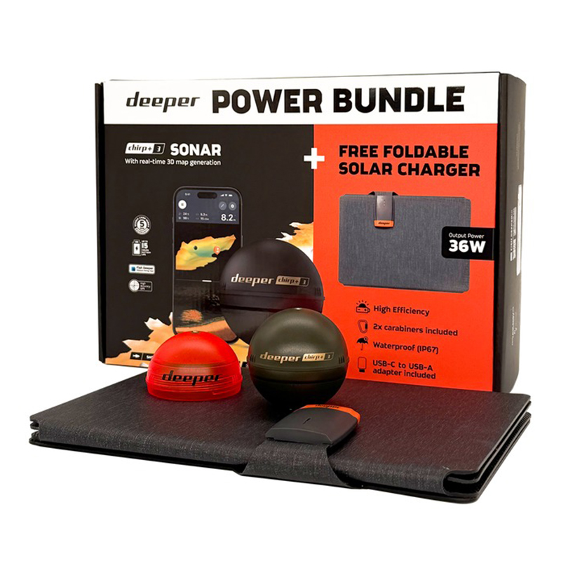 Upgrade your fishing with the Deeper CHIRP+ 3 sonar and portable 36W solar charger. Build your own 3D depth maps, track every contour, and fish with total accuracy. The solar charger delivers up to 12 hours of runtime with just 2 hours of sun. Ideal for land, kayak, or boat fishing.
