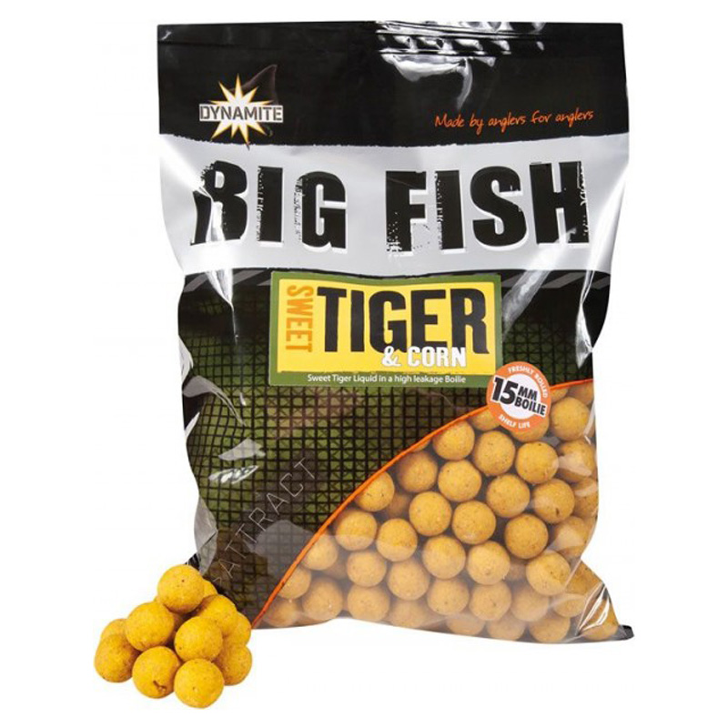 Dynamite Baits Big Fish Sweet Tiger & Corn Boilies 1,8kg, a fantastic addition to our Big Fish range of boilies. Based on our super popular Sweet Tiger Liquid with the added attraction of corn. A firm textured but high-leakage bait suitable for feeding at distance. Available in 1kg, 1.8kg and 5kg bags in 15 and 20mm (20mm size is export only).