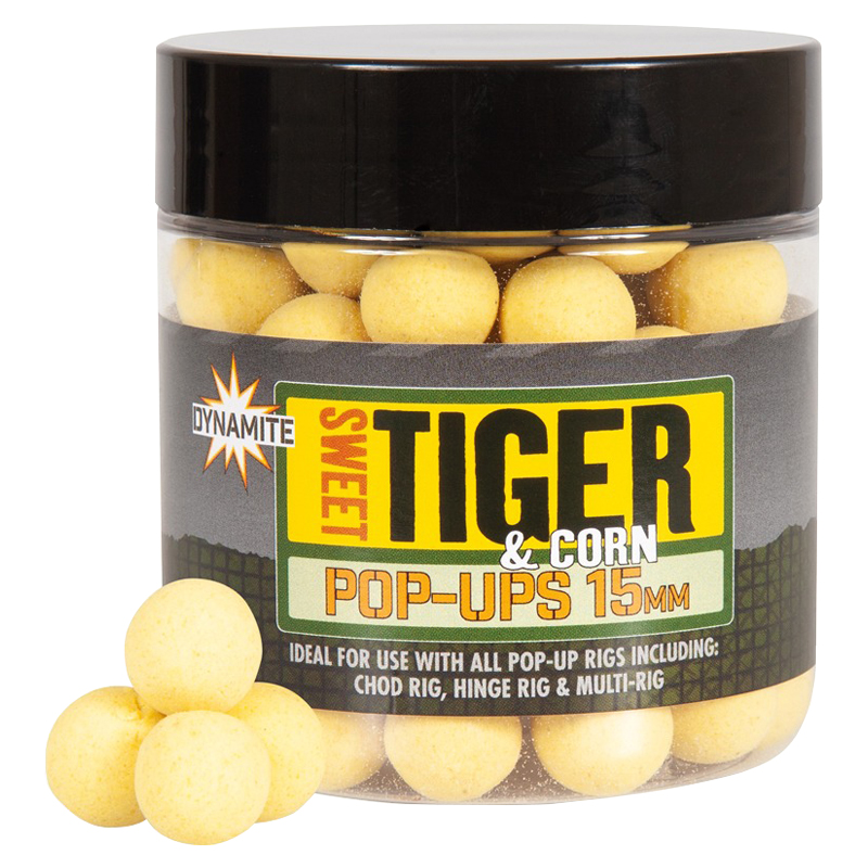 Dynamite Baits Big Fish Sweet Tiger & Corn Pop-ups 15mm - A matching pop-up for the Big Fish Sweet Tiger and Corn boilie. Added corn for a natural fish-attracting flavour. 15mm in size. Same creamy, sweet flavour as the boilie. Come in resealable tubs to keep in the freshness.