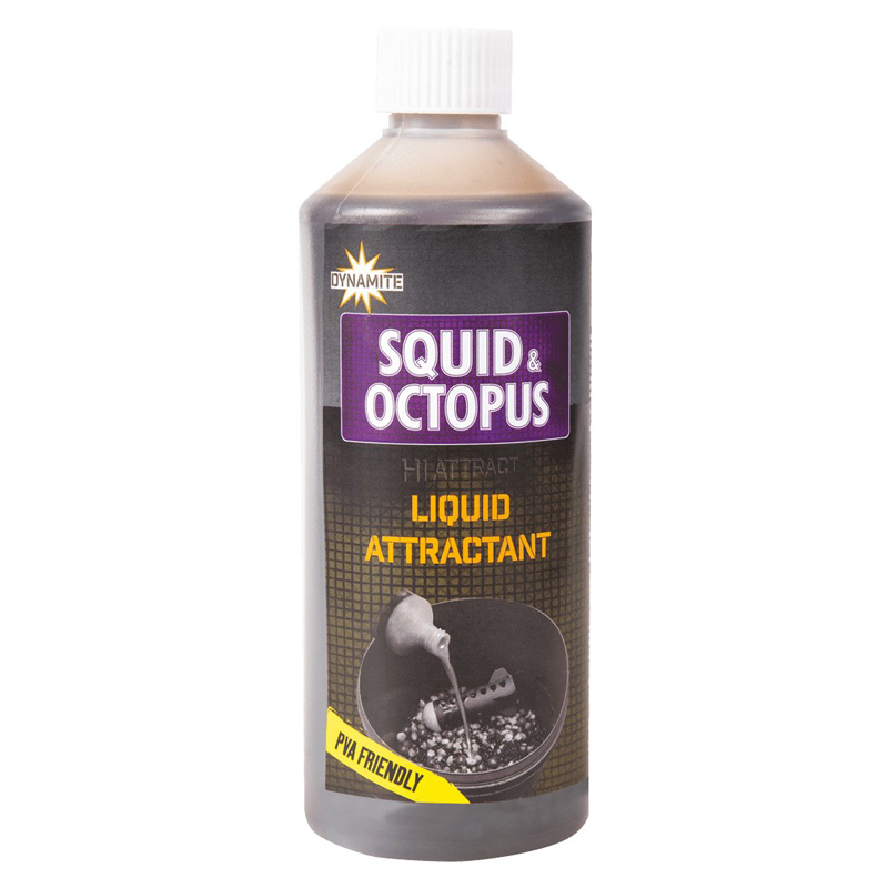 Dynamite Baits Squid & Octopus Liquid Attractant 500ml - Designed to match the popular, Squid & Octopus boilie range, the liquid glug can also be used independently as a highly attractive additive. Full of natural ingredients including fishy oils, the liquid is perfect for boosting hookbaits and spod mixes as well as using for mixing groundbait or putting into PVA bags.