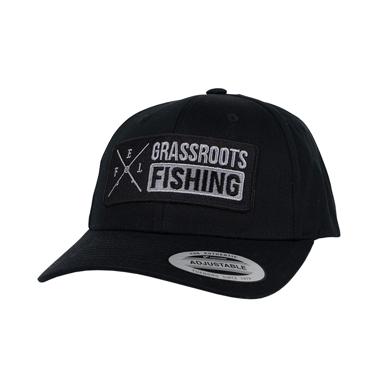 Black Yupoong snapback with curved visor and embroidered patch, stylish design.