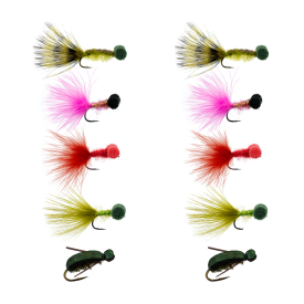 Perfect for fishing rainbow trout and trout in lakes, the Boobies Fly Pack contains 10 flies across 5 patterns (2 each). Ideal for slow fishing with sinking lines just above the lake bed, making it effective all year.