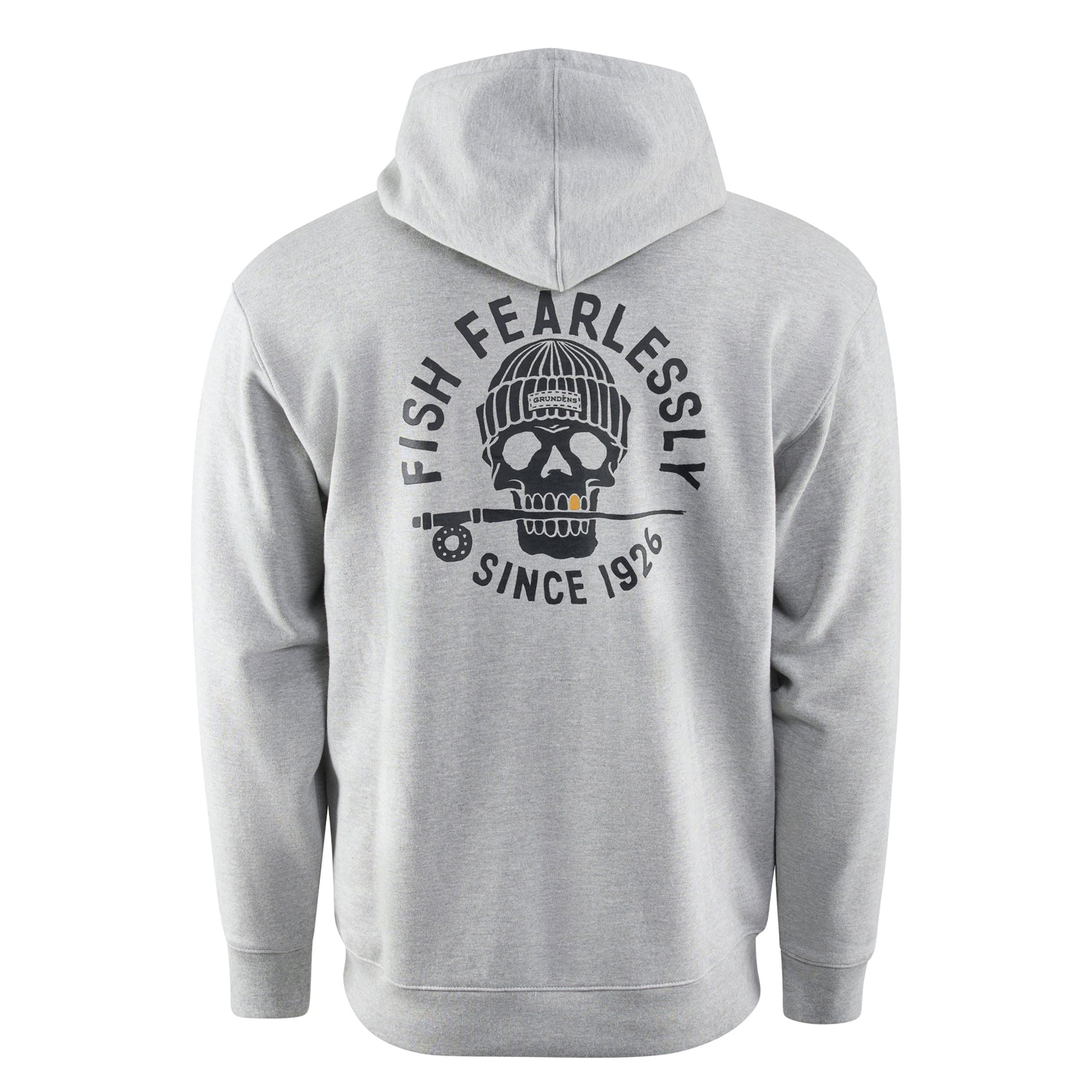Grundéns DeadStick Hoodie in Athletic Heather is stylish and comfortable, featuring a striking skull graphic inspired by Davy Jones' Locker.