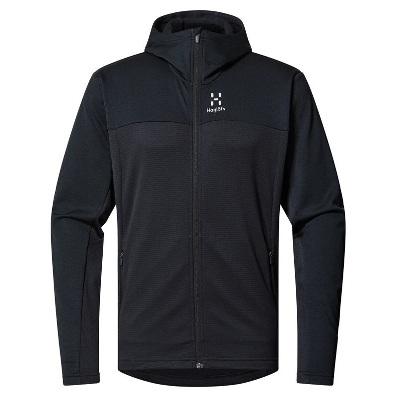 Haglöfs Lark Mid Hood Men True Black - Hike freely. This hoodie is perfect for the hiking trail and versatile enough for many types of outdoor expeditions. It's made from a blend of two recycled polyester fabrics with excellent moisture management and insulation properties - and a clever body-fit design ensures you get the most out of both. It also has two zippered pockets for cold hands or small items. Use it on its own or as a strategic layering piece.
