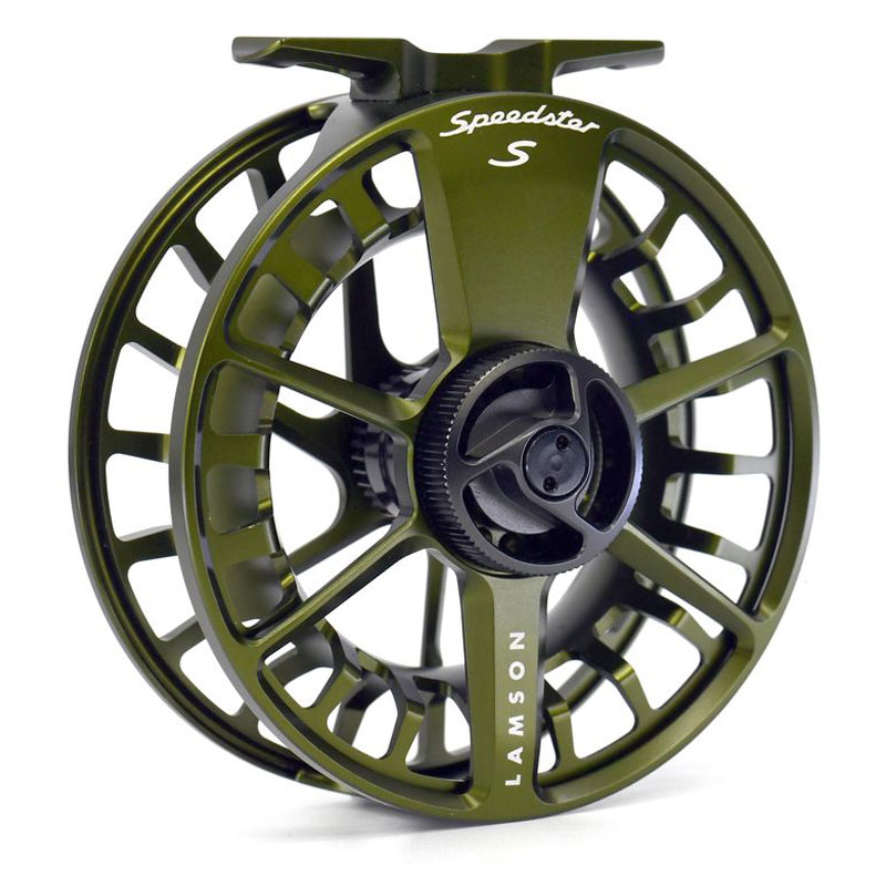 The Lamson Speedster S-Series Olive Green fly reel is lightweight with a large spool for faster line retrieval and smooth drag performance.