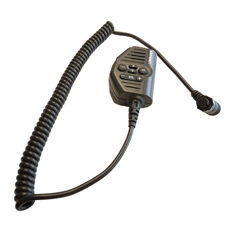 Lowrance Link-9 Remote Mountable Fist Mic. Can be connected to the front or rear of the radio, and optional extension cable allows the radio and mic to be mounted in seperate locations.