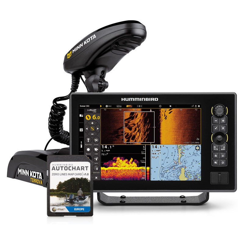 Let Humminbird Solix 10 control your Minn Kota electric motor, create routes, circulate around anchorages, follow depth contours on a Lakemaster chart or charts created with AutoChart Live and much more. The package includes the AutoChart ZeroLine chart, MKA-21 quick mount and the necessary cabling to connect the units. Complete with fuses and connectors.