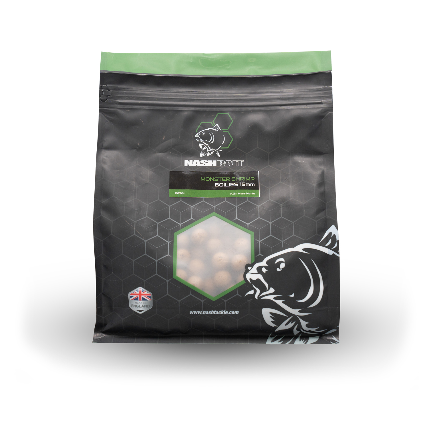 Nash Monster Shrimp Boilies are a complete food-source boilie designed for big carp, packed with fishmeal, crab, lobster oil, and Nashbait Salted Shrimp Paste.