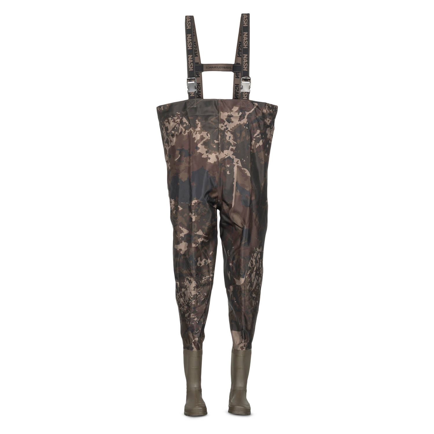 Durable chest waders in ZT camo with Zero Tolerance Wader Horn for easy wear. Features reinforced knee pads and anti-clog soles.