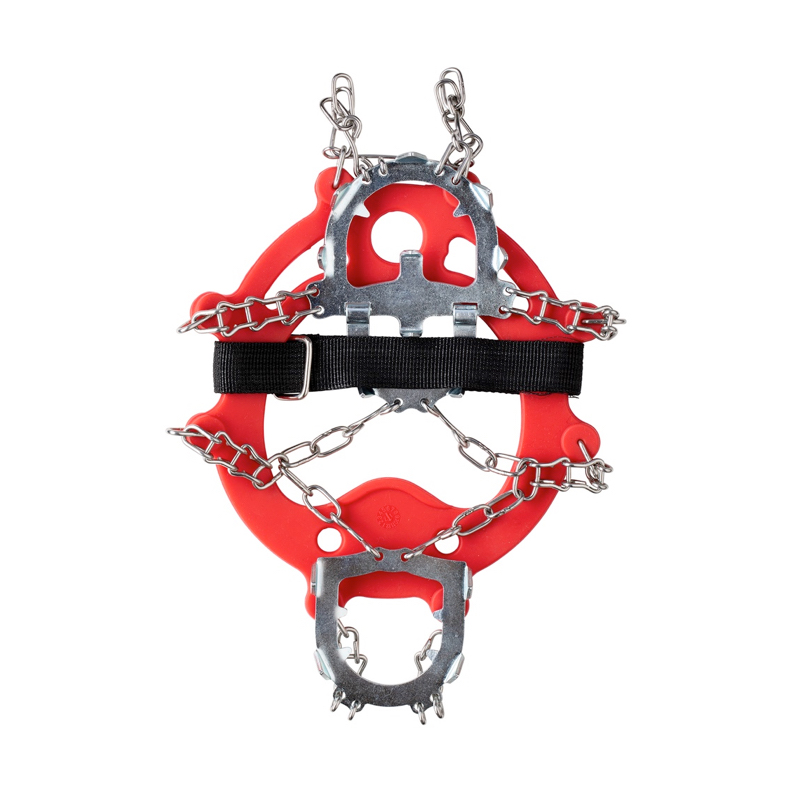 The chain and spikes are made of stainless steel. Durable rubber. Velcro closure above the foot for optimal fit around the shoe. Easy to put on and off. Storage bag included.