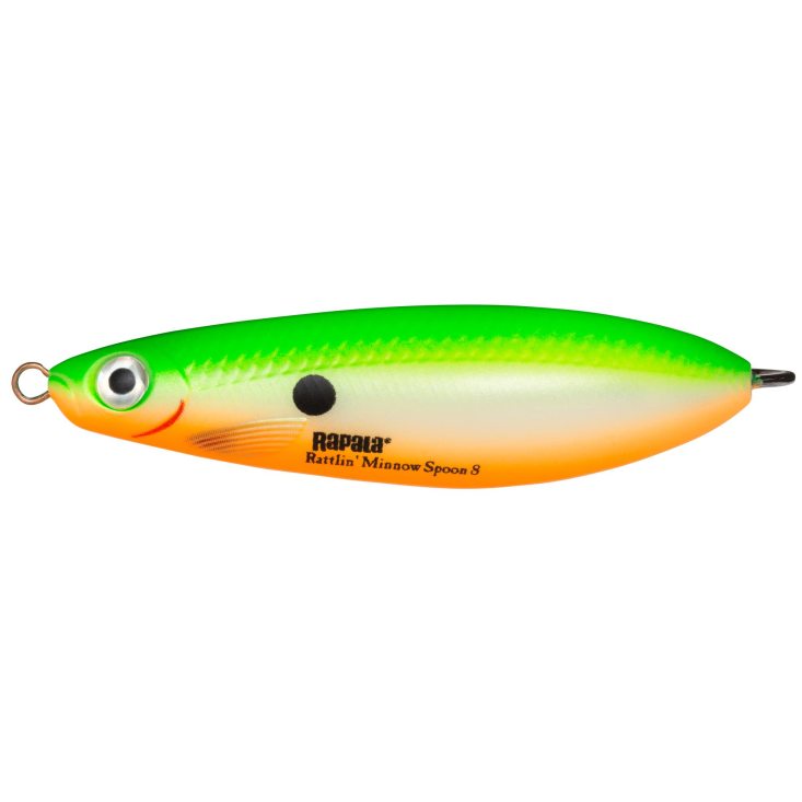 Rapala Rattlin' Minnow Spoon features a unique construction that combines the silhouette of a minnow with the action of a spoon. Wide, irregular sweeping action to create flash. Internal rattle chamber emits additional noise and vibration. Built with a heavy-duty single hook and a weed guard to be fished even in heavy cover. Balanced flutter on the drop with irregular kicks and strong body roll.