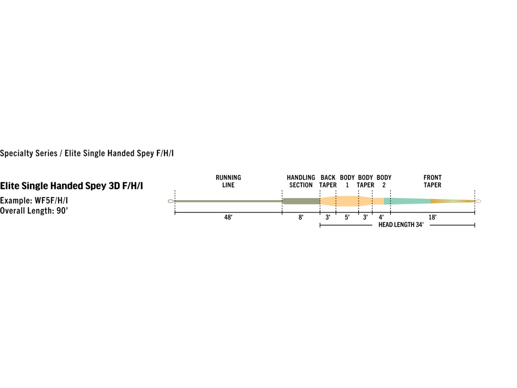 The RIO Elite Single Hand Spey 3D Flyt/Hover/Intermediate fly line is ideal for roll and Spey casts, performing efficiently at depths of 0.5 to 1 meter.