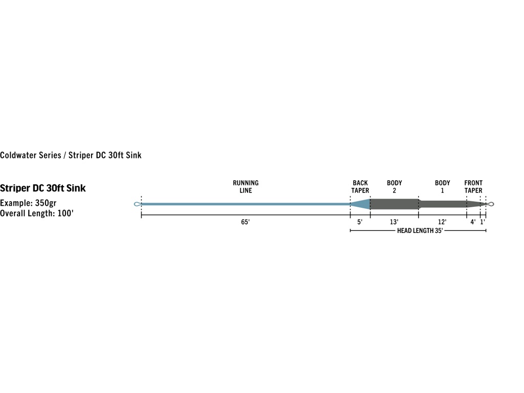 The RIO Premier Striper 30' Sink Tip features a 30-foot sinking tip and a heavier head, making it easy to cast even in challenging conditions. It is available in three versions: Flyt (blue head, yellow running line), Intermediate (clear head, luminous running line), and 30' Sink Tip (black head with running line color varying by weight/class). The SlickCast coating reduces friction for smoother, longer casts and enhanced durability.