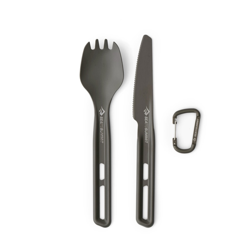 Sea To Summit Frontier UL Cutlery Set 2pcs Spork And Knife - The 2-piece frontier cutlery set combines a knife and spork for those backcountry chefs who do more with less. Hard-anodized aircraft-grade aluminium makes these utensils as strong as they are light; sea to summit design makes them ergonomically functional. A mini-carabiner keeps the set clipped together when the utensils are stowed after use.