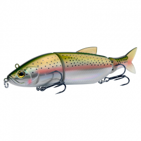 - Hard bodied jointed swimbait with soft tail and dorsal fin