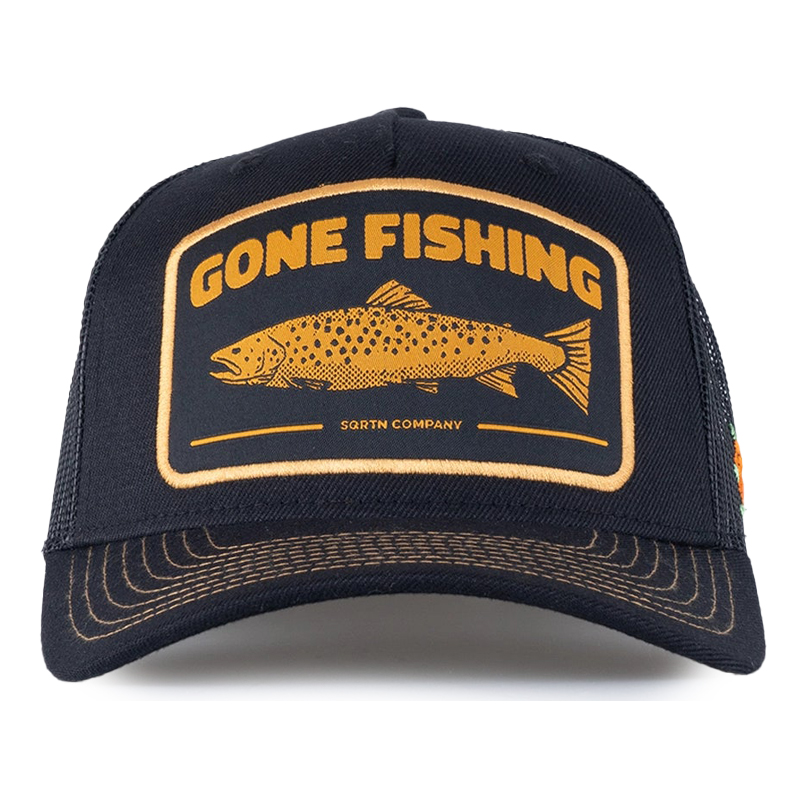 The SQRTN Trout Trucker Cap Black Limited Edition offers a stylish snapback design with multiple embroidered details. Adjustable size to fit most, featuring a pre-curved brim.