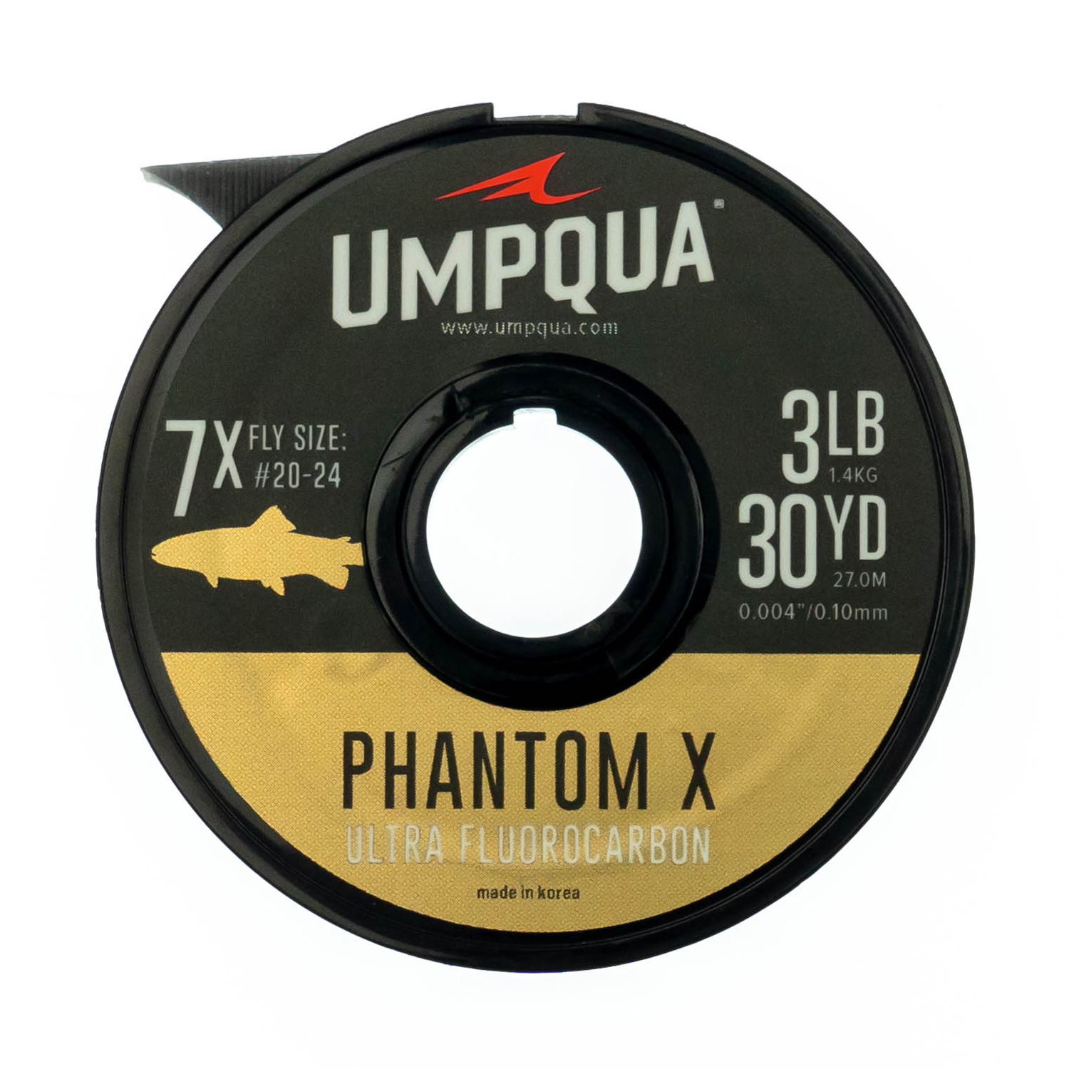 Umpqua Phantom X Fluorocarbon Tippet - Strong, sensitive, and invisible. Phantom X is the strongest and most invisible tippet on the market with low stretch and high abrasion resistance. Length: 27 meters