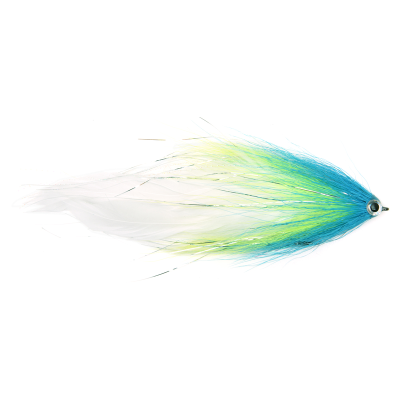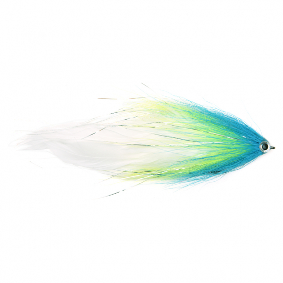 Blue, fluorescent yellow and white - we wouldn't go pike fishing without these. The budgerigar's colors are a combination familiar to many from the Marabou Deceivers made famous by the Heittokalastajan Hauki bible twenty years ago and have long been our favourite. Here, the colours are dressed in a more modern, hollow-style bucktail fly topped with a schlappen tail. If you had to go after pike with one fly, this would be an easy choice!