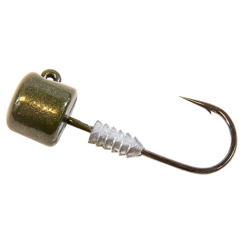 FEATURES • Signature mushroom-shaped head preferred by finesse enthusiasts • Heavy-duty Mustad® UltraPoint® hooks • Split keeper design is easy to rig and holds ElaZtech® and conventional soft plastics securely • Available in 1/15, 1/10, 1/6, and 1/5 ounce weights in green pumpkin and black finishes • 5 jigheads per pack