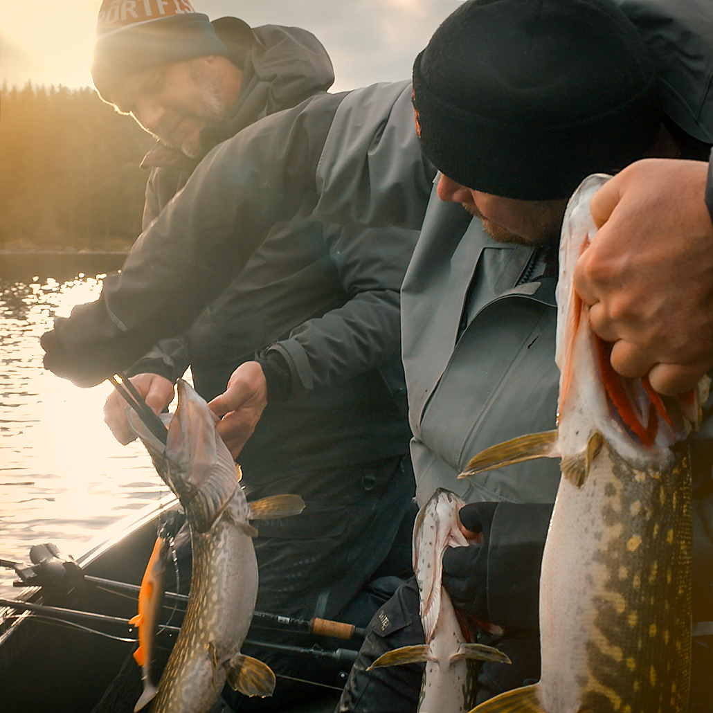 Fish high at the beginning and try your way down in the water columns, the pike rise quickly and can stand close to the surface.